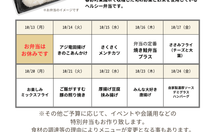 日替わり手作りお弁当 10/14~ お弁当メニュー 2025.10.02 10月13日(月)は祝日の為、お休みさせていただきます。 記事のタイトルとURLをコピーする Post 9/15~お弁当メニュー 前の記事