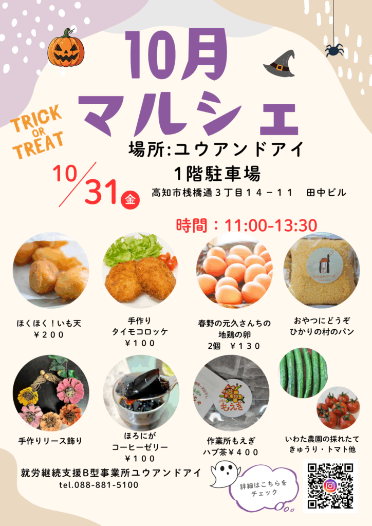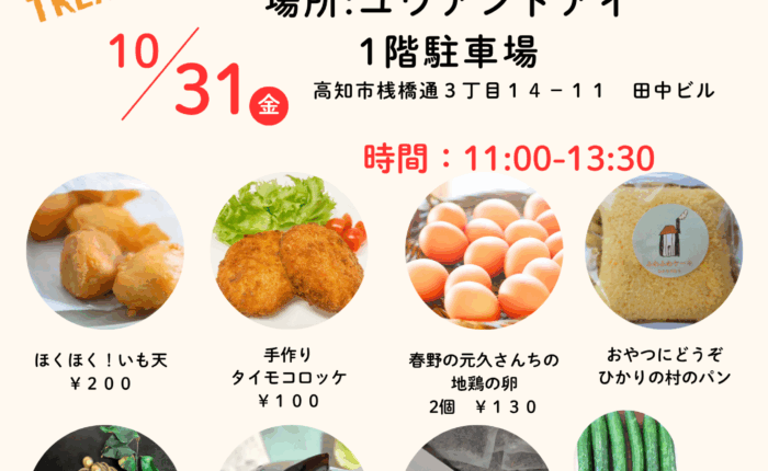 イベント告知 10月マルシェのご案内 2025.10.23 10月31日(金)に10月のマルシェを開催します。 岩田農園で収穫したさつまいもの「ほくほく!いも天」や前回、人気だった「ほろにがコーヒーゼリー」も 販売します。 お近くにお越しの際はぜひお立ち寄りください🍅 記事のタイトルとURLをコピーする Post 10/27~お弁当メニュー 前の記事