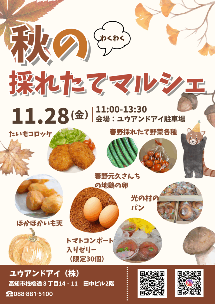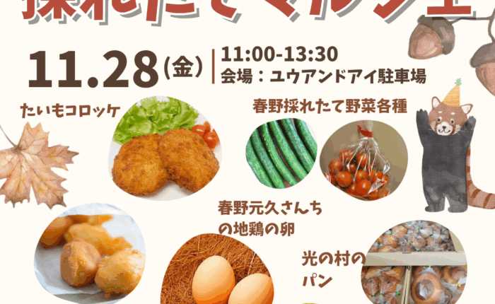 イベント告知 秋のマルシェ 2025.11.21 秋のわくわく採れたてマルシェを11月28日(金)に開催します。 開催時間 11:00~13:30 開催場所 ユウアンドアイ1F駐車場 冬野菜も岩田農園の畑で採れ始めました。 今回のマルシェで販売予定です(^^) 記事のタイトルとURLをコピーする Post 11/25~お弁当メニュー 前の記事