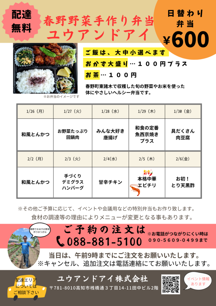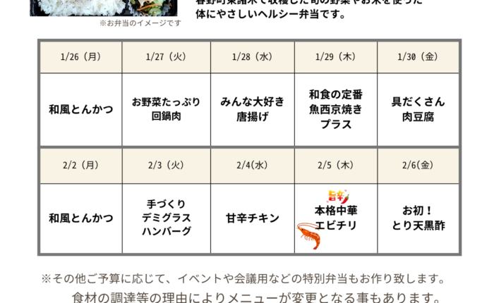日替わり手作りお弁当 1/26~お弁当メニュー 2026.01.13 1/26~2/6のお弁当メニューです。 記事のタイトルとURLをコピーする Post 12/22~お弁当メニュー 前の記事 1月 マルシェ 次の記事
