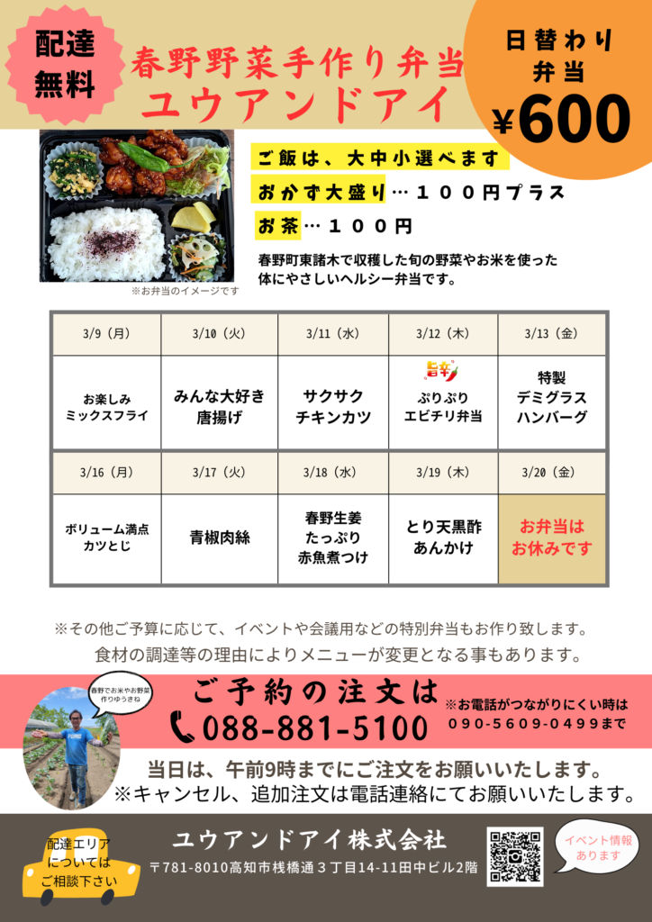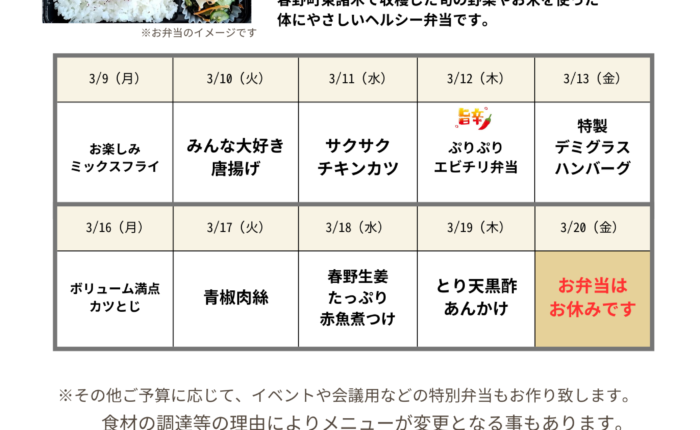 日替わり手作りお弁当 3/9~お弁当メニュー 2026.03.02 3/9(月)からのお弁当メニューです。 20日(金)は祝日の為、お休みとさせていただきます。 記事のタイトルとURLをコピーする Post 2/24~お弁当メニュー 前の記事
